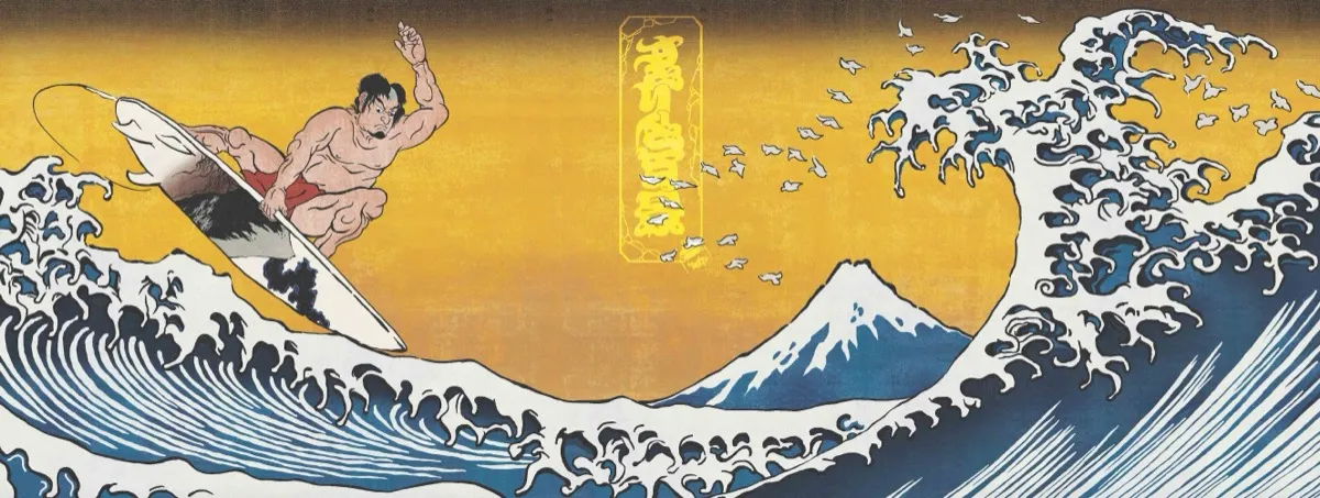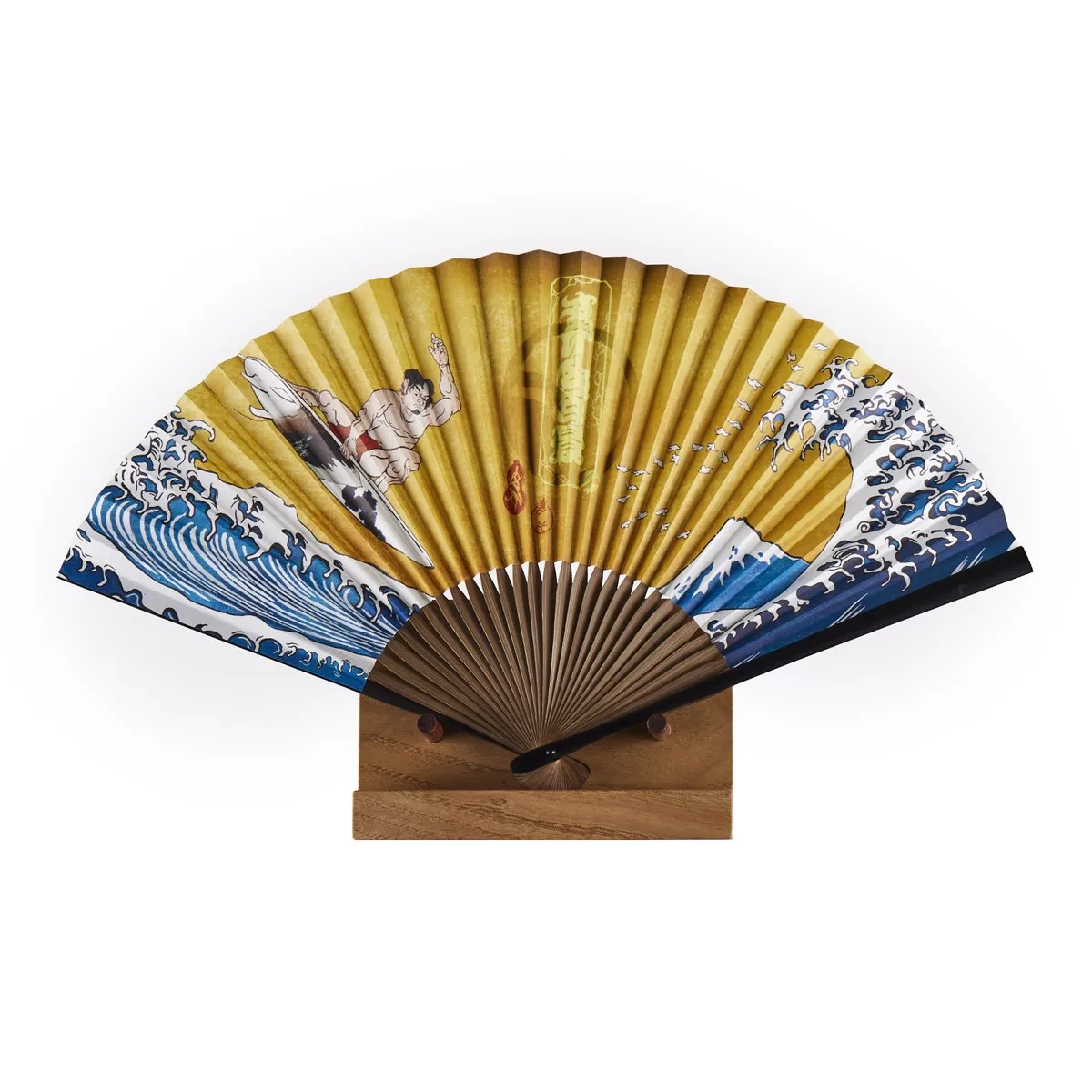 Collaborative folding fan by Naga x KAPUKI. Surfing motif.